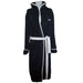Black super soft fleece hooded robe with contrasting white piping & matching belt. Features embroidered design motifs to front & back.
